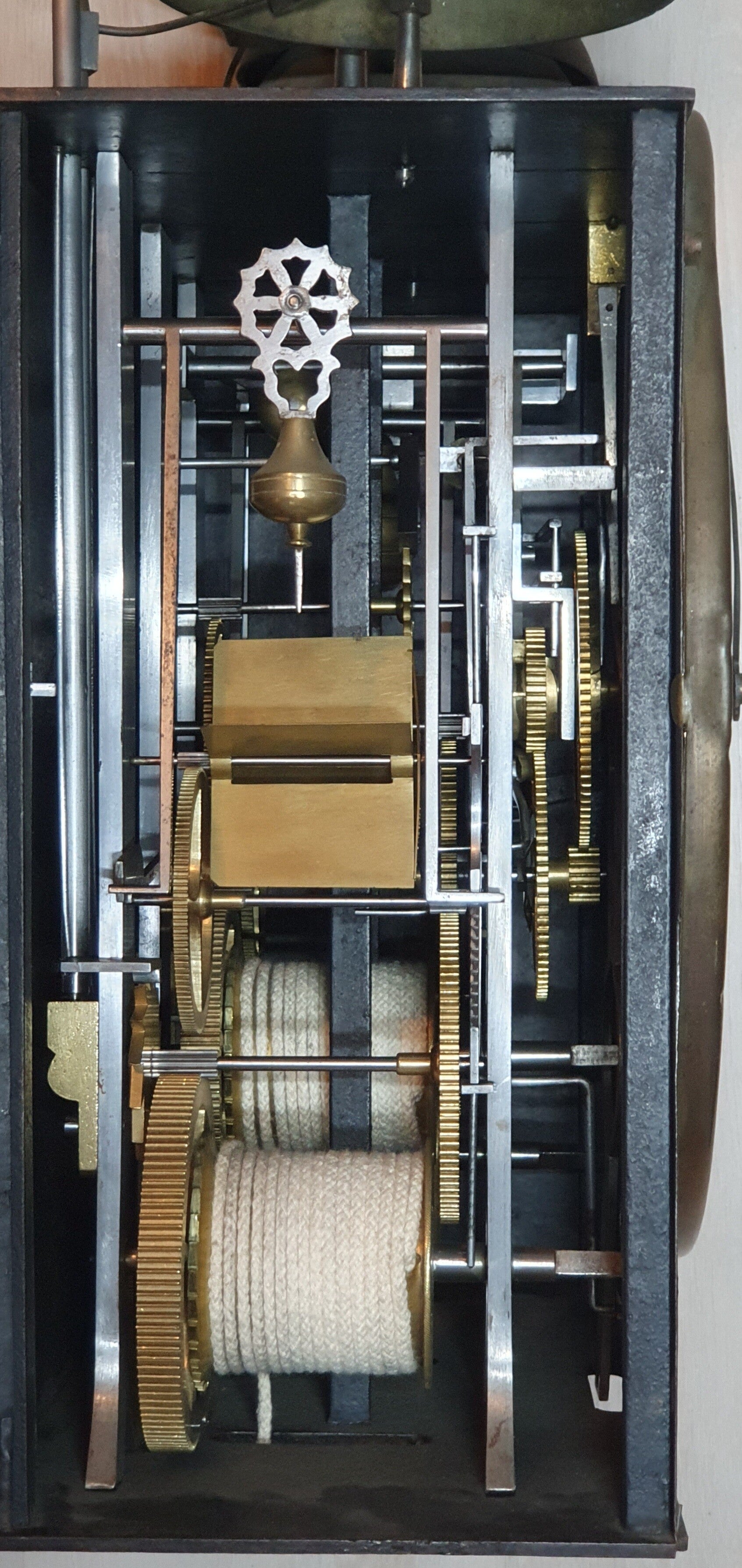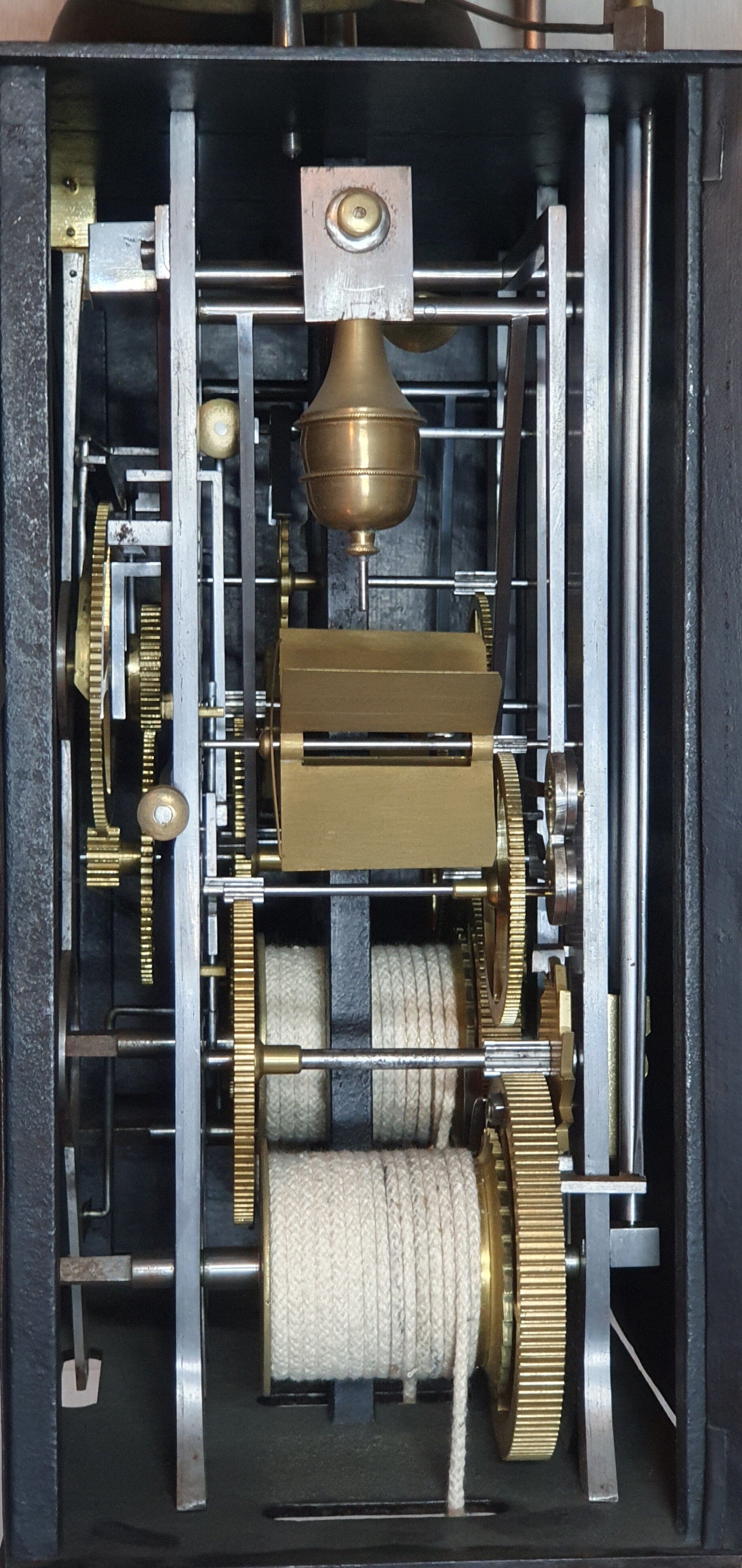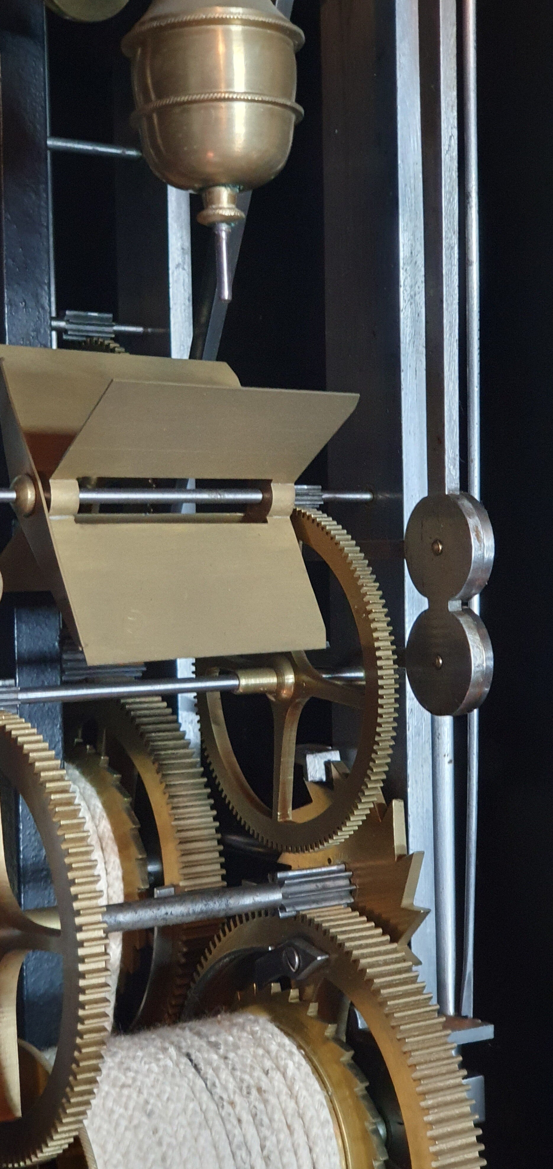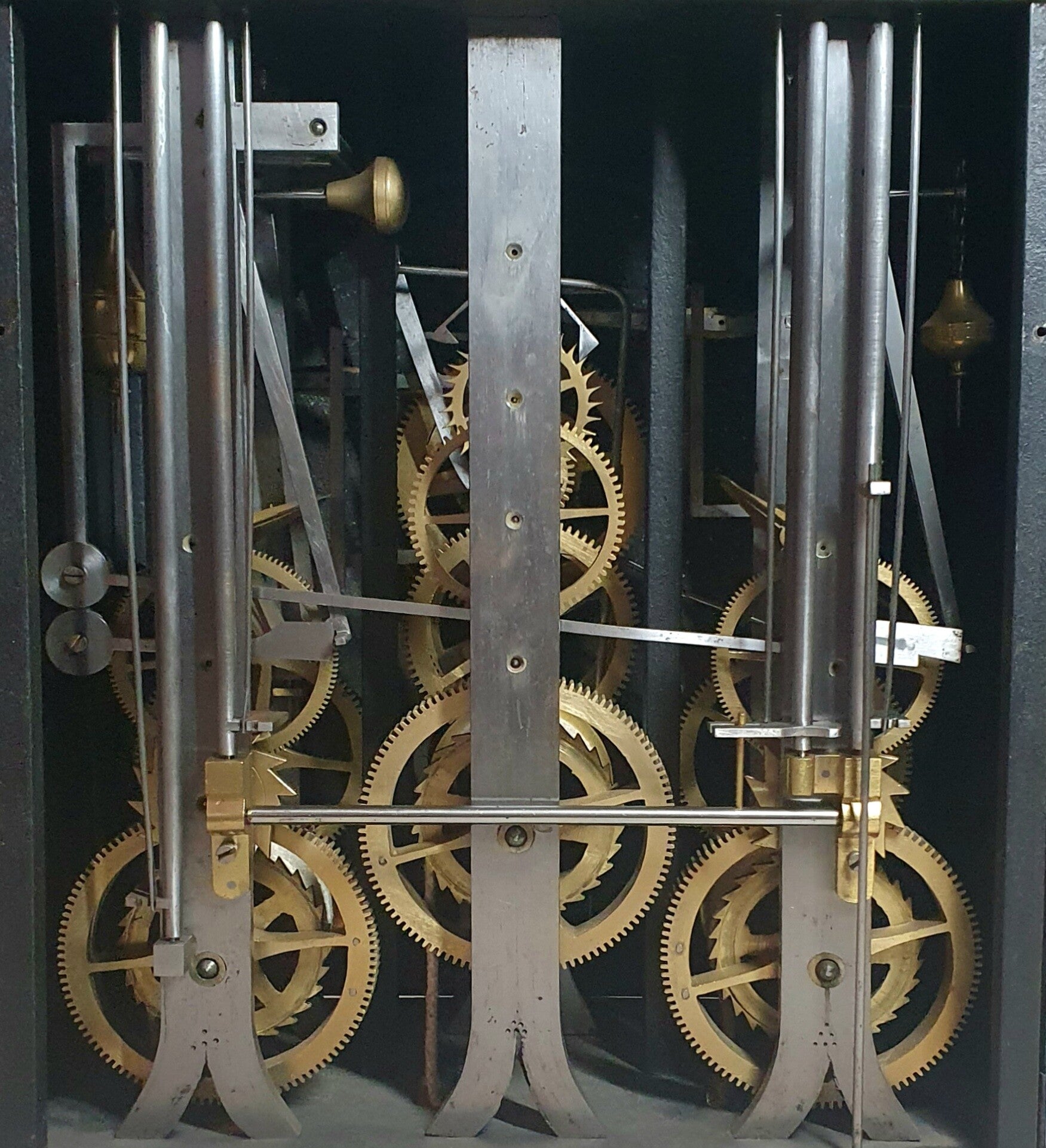 Drie zware gewichten zorgen voor de aandrijving van het gaand werk met ankergang, het slagwerk én het kwartierslagmechanisme, wat getuigt van een geavanceerde en zeldzame uitvoering.