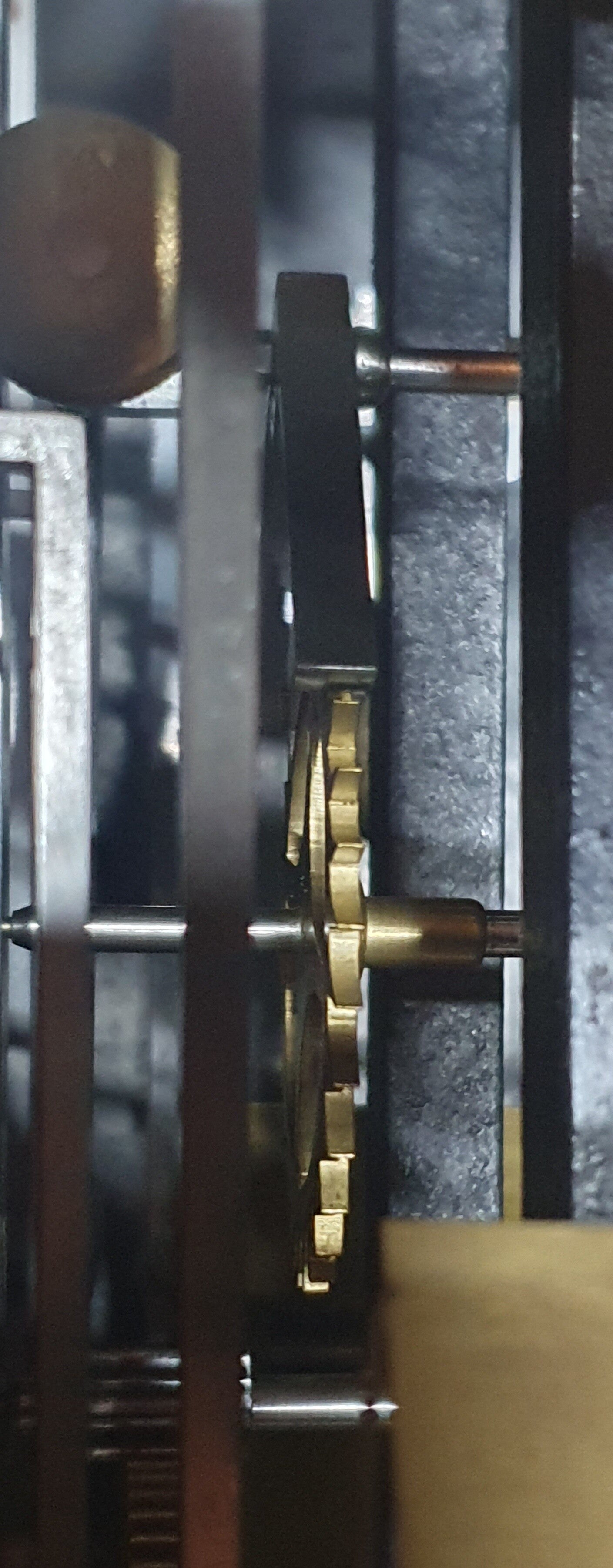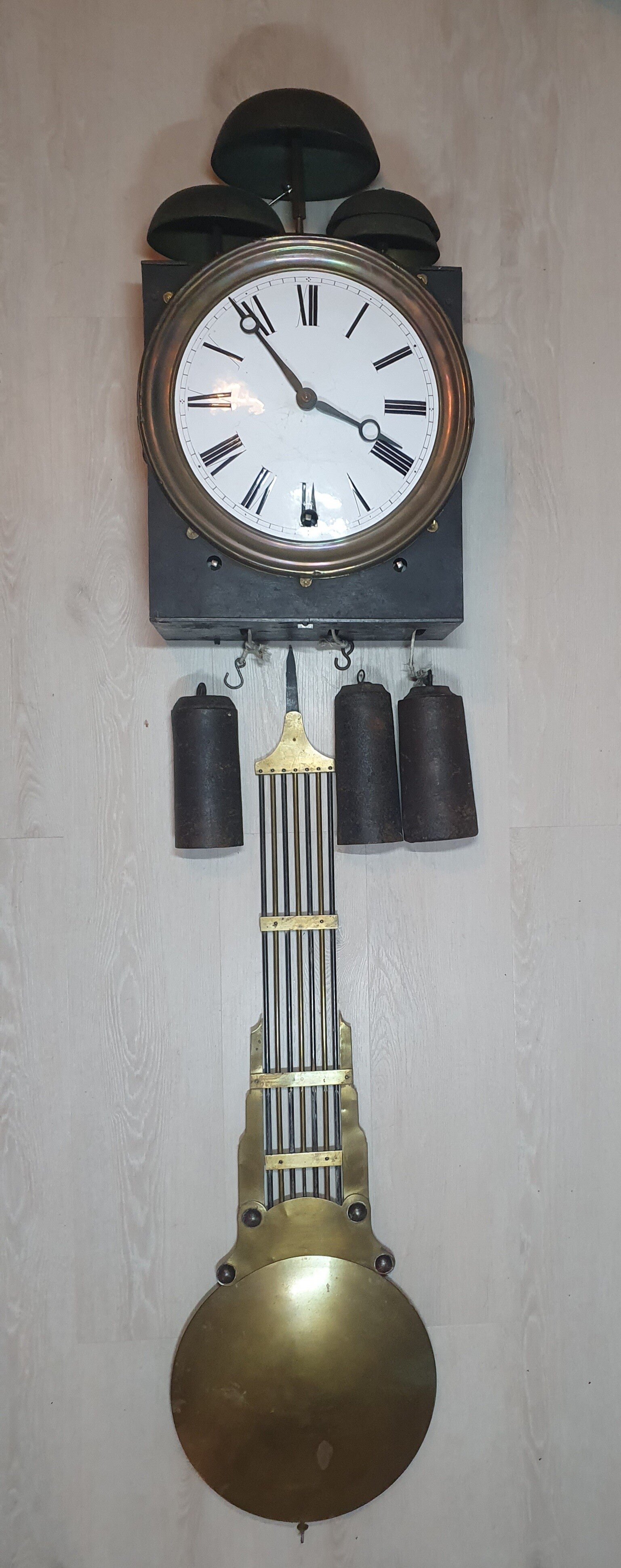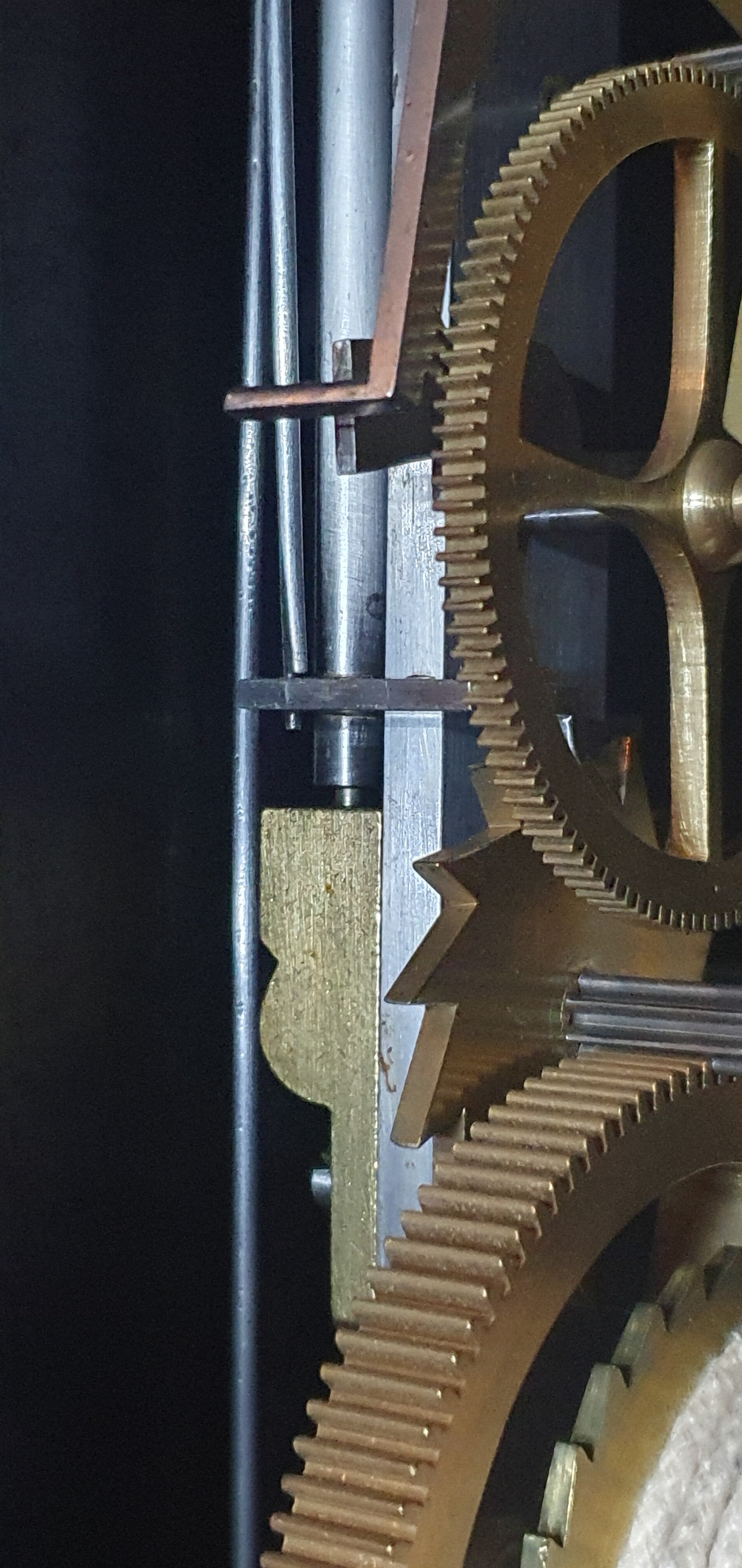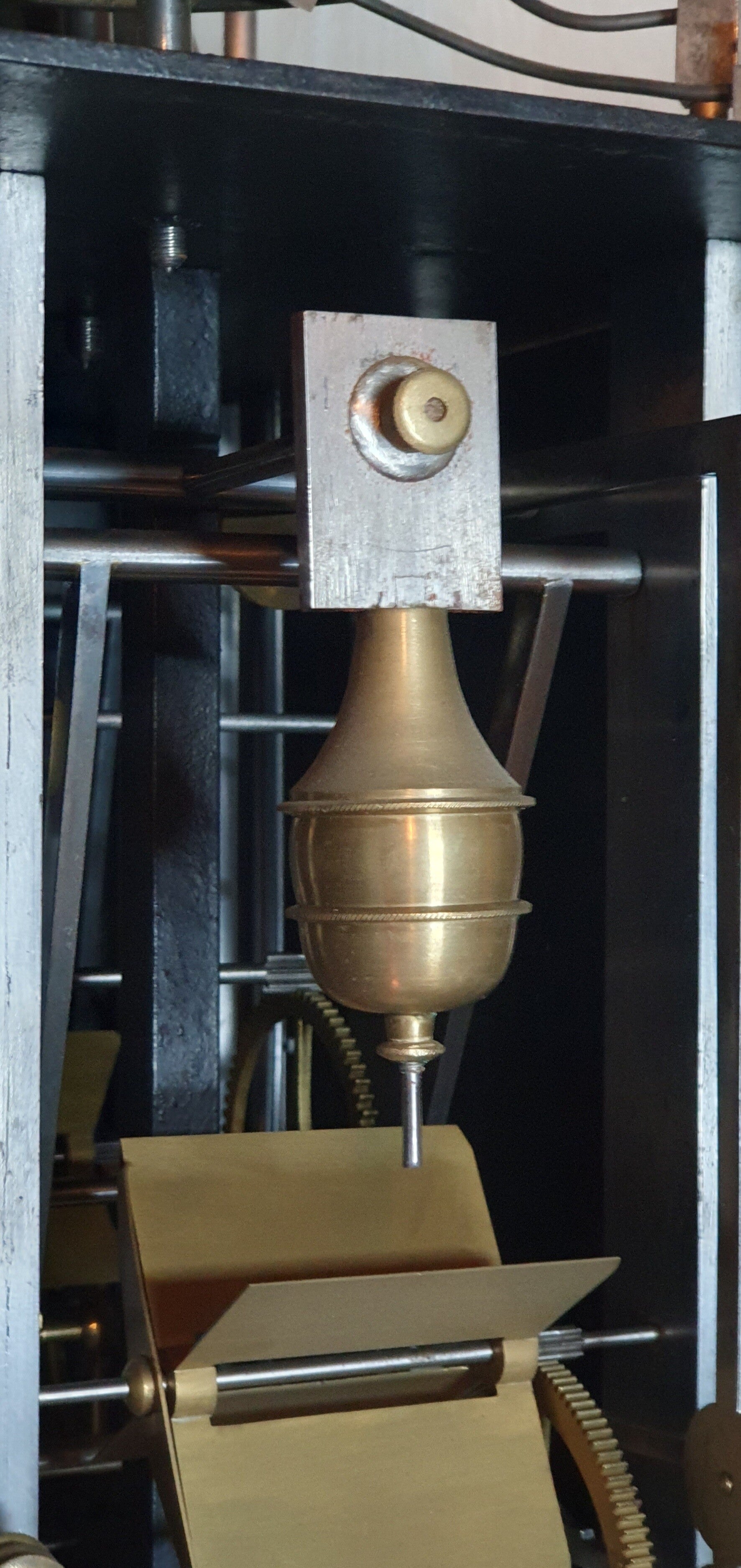 Drie zware gewichten zorgen voor de aandrijving van het gaand werk met ankergang, het slagwerk én het kwartierslagmechanisme, wat getuigt van een geavanceerde en zeldzame uitvoering.