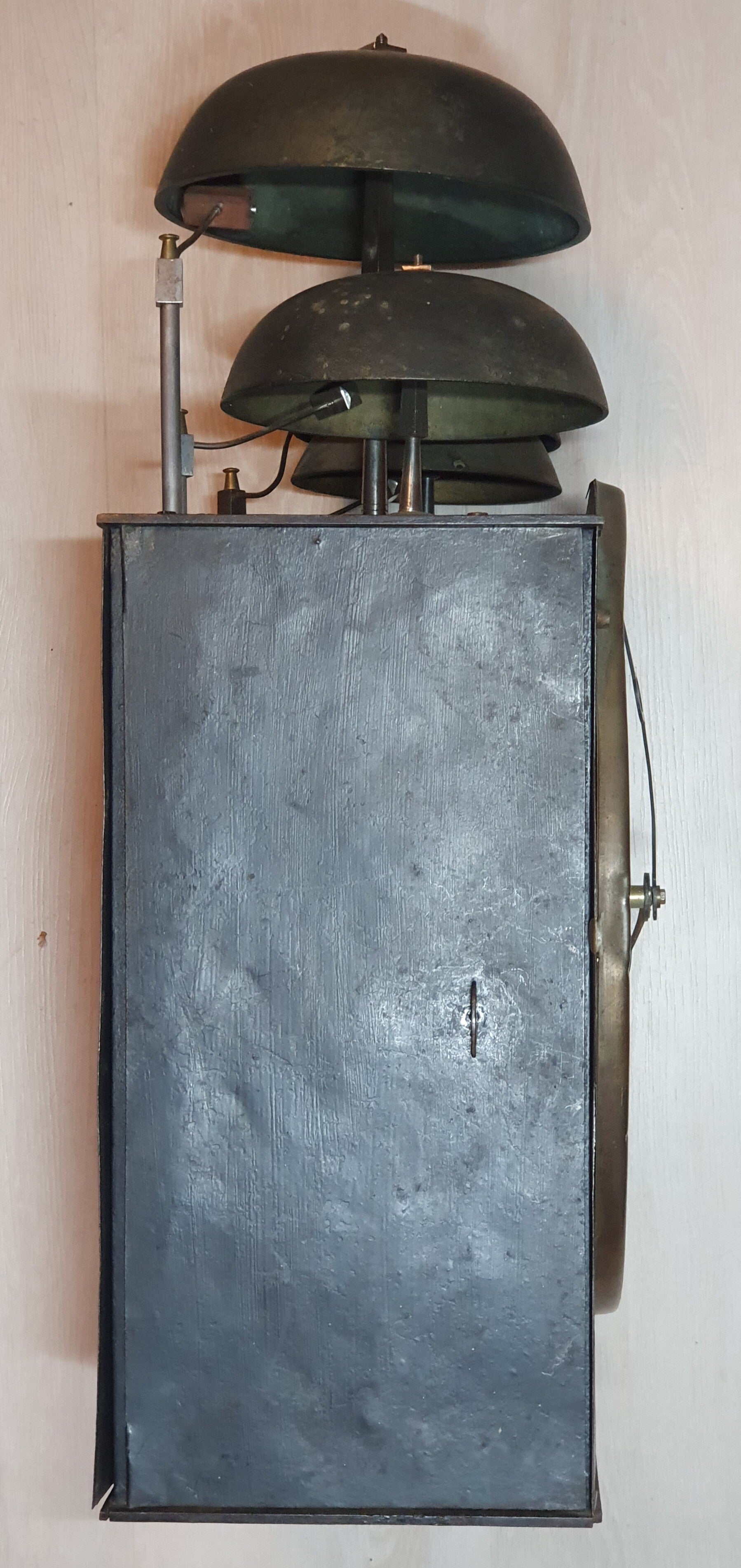 Afmetingen: breed 33,3 cm. hoog 37,0 cm. en diep 18,5 cm. De slinger is 106,0 cm. lang en de lens heeft een diameter van 32,0 cm. De grootste bel een diameter van 18,7 cm. en 7,5 cm. hoog. De kleinste bel met een diameter van 12,5 cm.