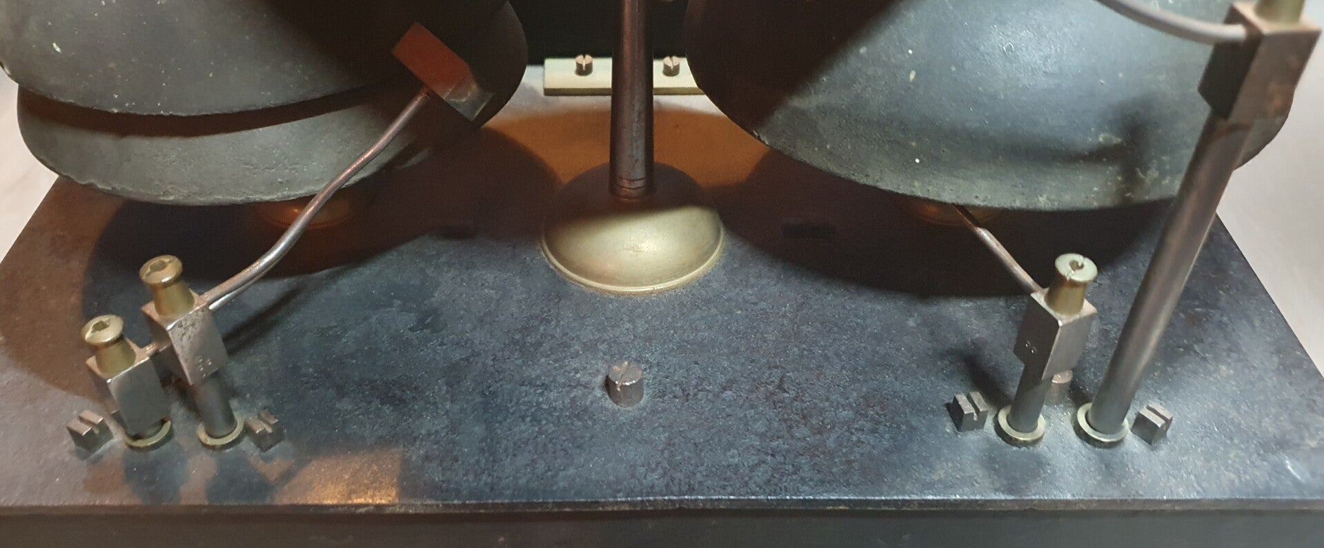 De klok is uitgerust met vier sierlijke bellen, die zorgen voor een volle, heldere slag die elk kwartier een melodieuze structuur geeft, met een diepere, sonore toon op het hele uur.