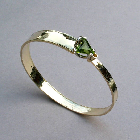 Een 14 karaats geelgouden ovale armband met een witgouden zetting. Bezet met een triangel geslepen natuurlijke peridoot.